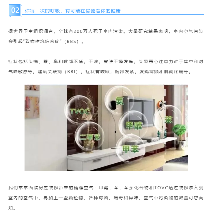 我們常常面臨房屋裝修帶來的糟糕空氣:甲醛、苯、苯系化合物和TOVC透過裝修滲入到室內的空氣中,再加上一些顆粒物,各種霉菌、病毒和異味,空氣中污染物的數量可想而知。
