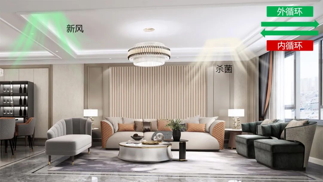 當(dāng)室內(nèi)較大顆粒(5~10μm以及大于10μm,通常為飛沫、灰塵、花粉等)指數(shù)比較高時(shí),容易讓細(xì)菌和病毒長(zhǎng)期滯留在室內(nèi)環(huán)境中,系統(tǒng)此時(shí)會(huì)自動(dòng)開啟新風(fēng)凈化設(shè)備,通過凈化濾網(wǎng)降低較大顆粒物的存留;